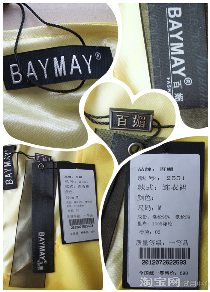 Collar label and tags, is hundred flatters BAYMAY LOGO, a registered trademark. Tags clearly indicate the name, style, size, composition ~ ~