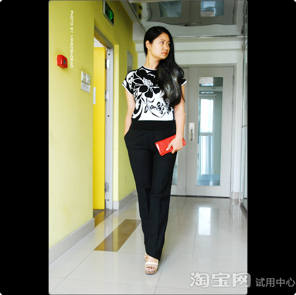 The second kind of hair style: black and white knitted T-shirt + + + go nude heels black trousers